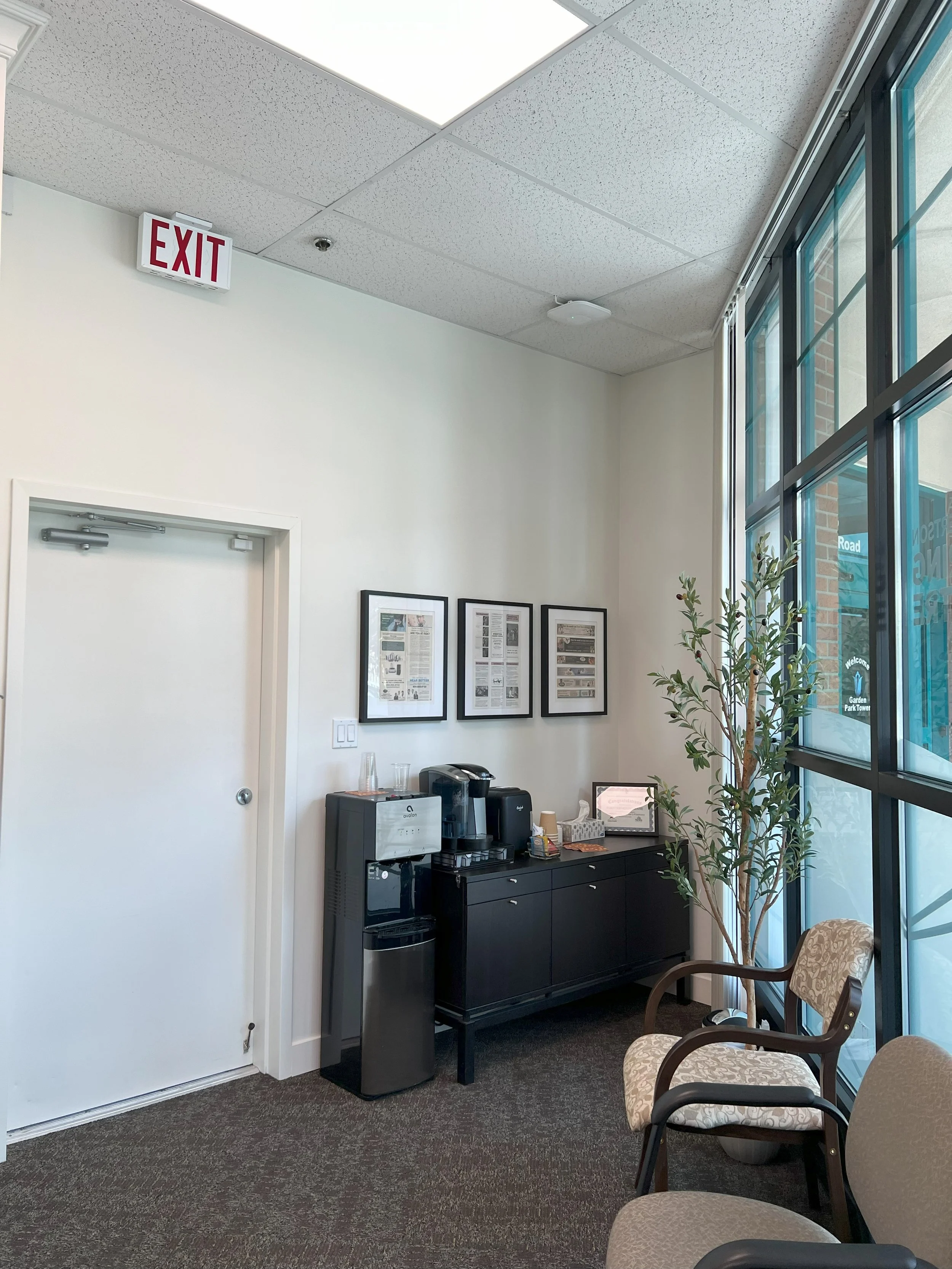 Office corner with chairs, coffee machine, water cooler, framed photos, exit sign, indoor building access to the lobby, and window view.