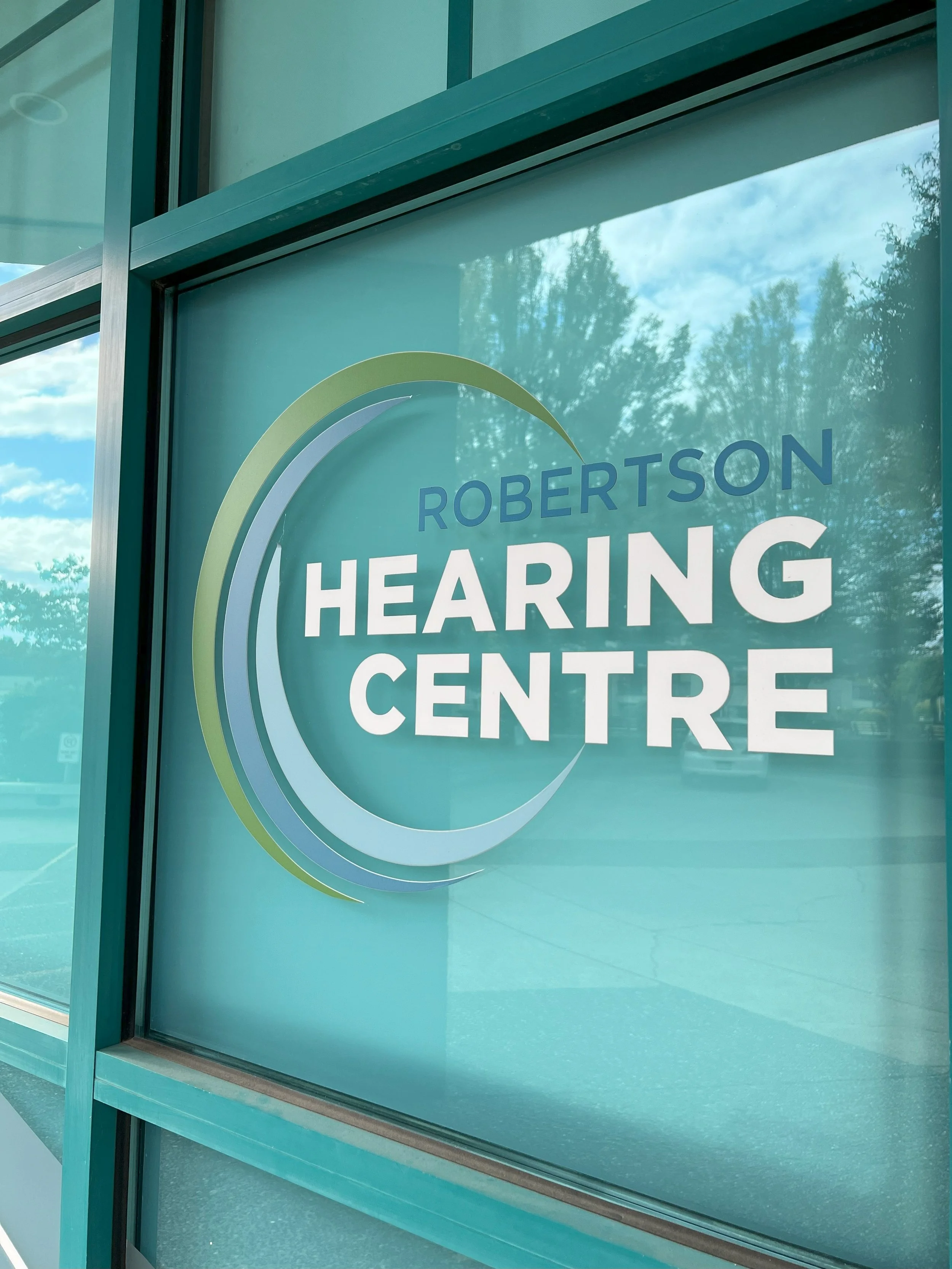 Window with "Robertson Hearing Centre" logo and reflections, teal background.