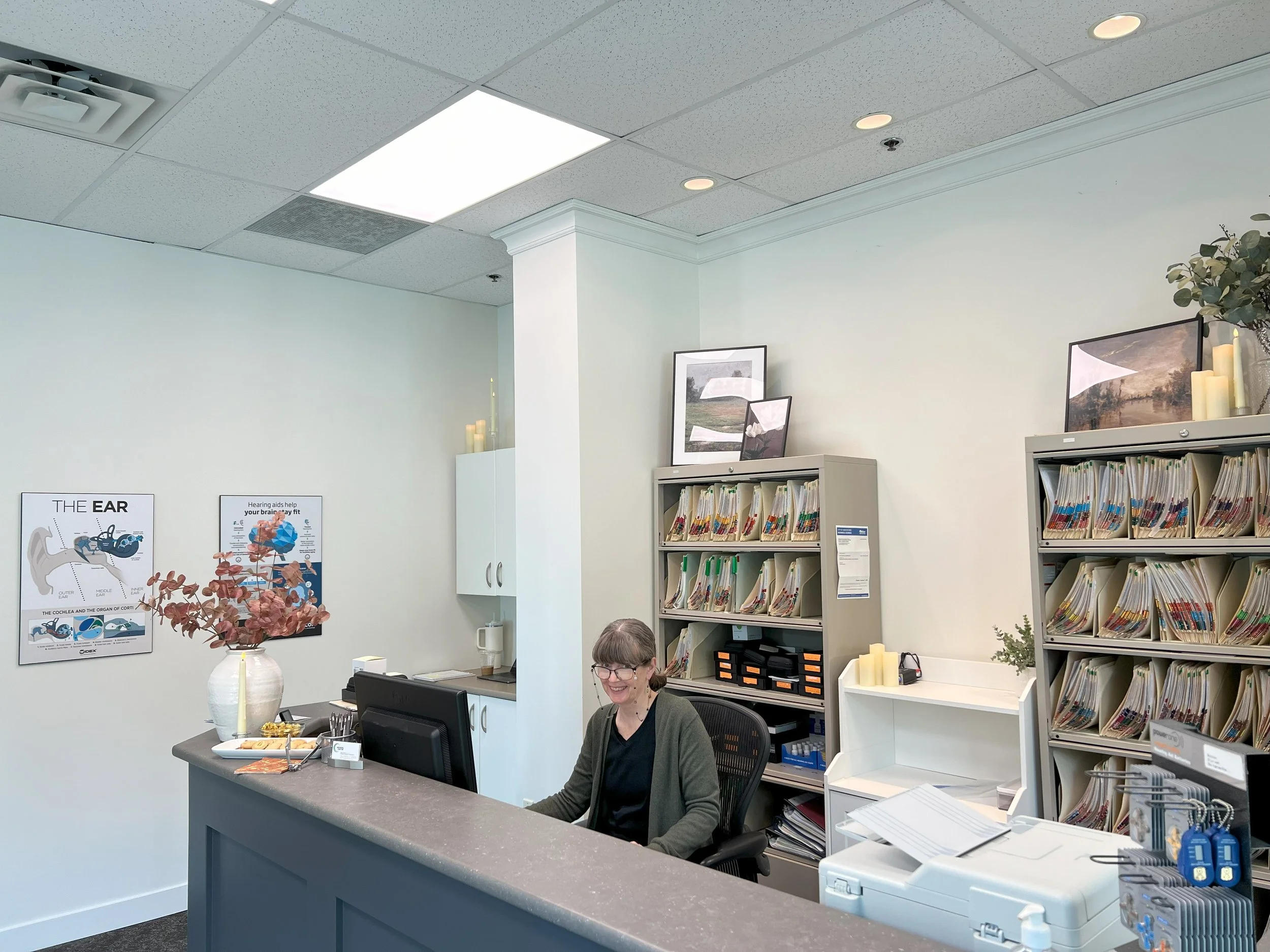 Reception area in a medical office with a smiling woman at the desk, featuring file shelves, informational posters about the ear, and decorative elements like a vase with flowers. Welcoming reception area.